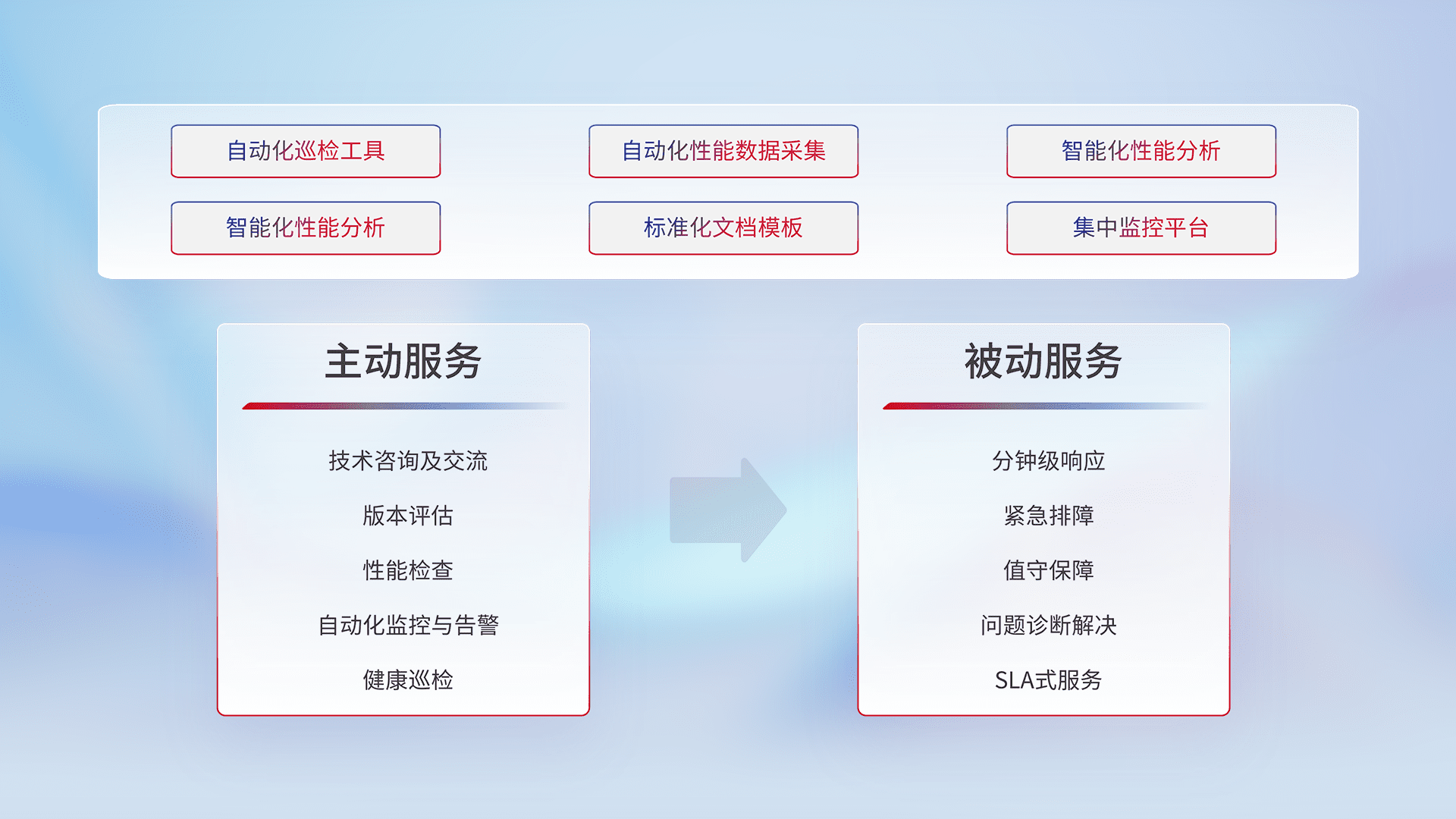 智能化工具和标准化文档,,保障服务质量,,提供主动服务(包含技术咨询、、、、版本评估、、、、性能检查、、、自动化监控与告警、、健康巡检)和被动服务包含(分钟级响应、、、紧急排障、、、值守保障、、、、问题诊断解决、、、SLA服务)。。。。